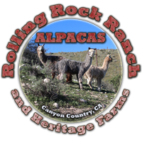 Rolling Rock Ranch Heritage Farms is located in the beautiful San Gabriel Mountains. We specialize unique heritage animals and crops. We are currently growing our Suri Alpaca herd and will be offering animals and fleece for sale soon. In Spring/Summer 2014 we expect to have Blue Slate Heritage Turkey chicks available for sale and may have several breeds of blue and green egg layer chickens available as well. We are currently working on our new website, for now please visit our facebook page for photo's of the ranch, animals, apple orchard, gardens and orchids.